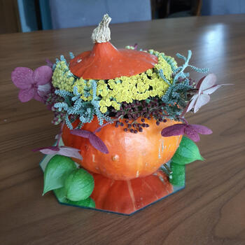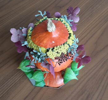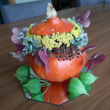 De pitten en een deel van het pompoenvlees verwijderen en de holte vullen met op maat gesneden, natte oasis zodat de oasis enkele centimeters boven de rand uitsteekt.
