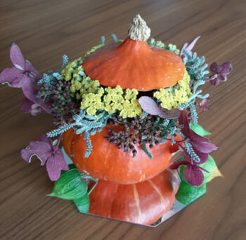 In de onderkant van het pompoendekseltje drie stukken satéstok steken en hiermee de pompoen afsluiten door ze vast te prikken in de oasis.
