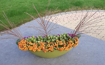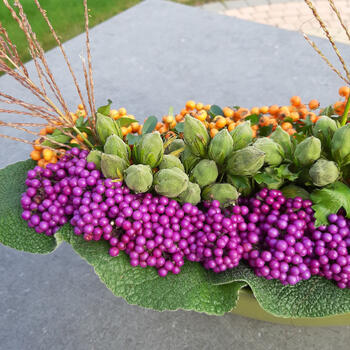Oranje vuurdoornbessen, paarse callicarpabessen, groene zaaddozen van de hibiscus, groene bladeren als bodembedekking, krammen