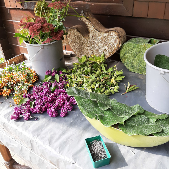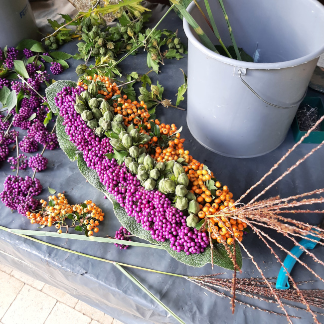 De bovenkant bedekken met groene bladeren die je vastprikt met rammen.