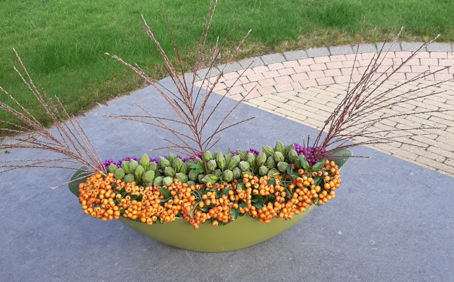 Pluimen van tijgergras of prachtriet (facultatief), 1 bootvormige vaas, natte oasis