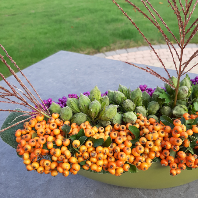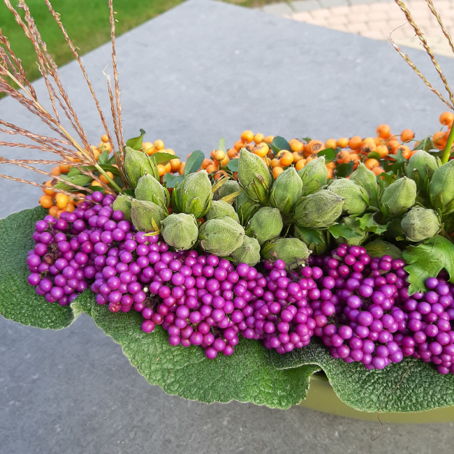 Oranje vuurdoornbessen, paarse callicarpabessen, groene zaaddozen van de hibiscus, groene bladeren als bodembedekking, krammen