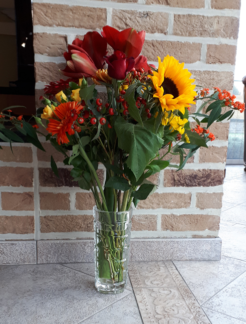 1 Amaryllis, 1 zonnebloem, 2 rode rozen, 4 euphorbia’s, 3 takken rozebottels, 1 tak gele trosroosjes, 1 grote chrysant, 2 gerbera’s,