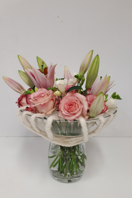 De vaas met koord of breiwol omwikkelen, zodat je een raster verkrijgt waar je de bloemen in kunt schikken.