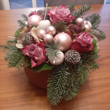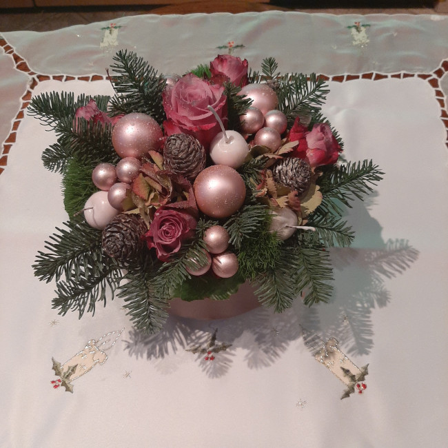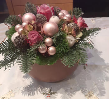5 roze in was gedrenkte sierappeltjes, 5 jonge dennenappeltjes, 5 rozerode rozen, 5 in bosjes gebonden hortensia’s, 15 kleine roze kerstballetjes en 3 iets grotere