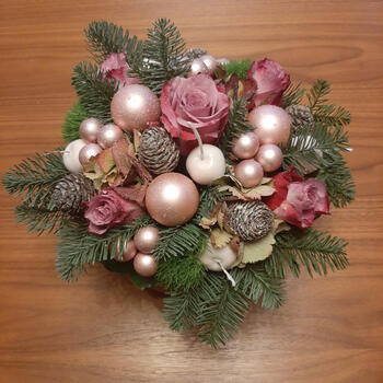 [Afbeelding met Bloemenontwerp, kerstmis, ornament, kerstboom Automatisch gegenereerde beschrijving] De sierappeltjes en de rozen ertussen verdelen, 1 roos in het midden bovenaan en de andere vier iets lager, rondom.