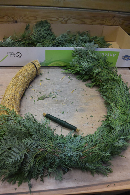 Bekleed de krans met groene den of conifeer. Begin in het midden en werk goed overlappend naar de twee uiteinden, wikkel goed vast met bindraad. Net voor je aan het uiteinde begint Steek je 2 of 3 cornus takken naast de pook in de strokrans en bevestig met veel lijm aan de pook en de krans. Laat opstijven en werk de uiteinden af zodat de pook niet meer zichtbaar is.