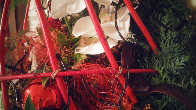 Steek nu de cornus takken in de krans. Maak met een schroevendraaier of een scherp voorwerp een opening en steek de takken erin. De onderste 5 takken steek je recht naar voor, de volgende takken steek je schuiner en schuiner naar boven, zodat je een mand kan vormen door vanboven de takken met touw samen te binden.