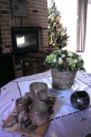 7 wit gele roosjes, 5 groene hortensia’s, 7 dennenappels op pook gezet, 7 kleine kerstballetjes op pook gezet, 7 groene skimmia bloemen, enkele takken gipskruid