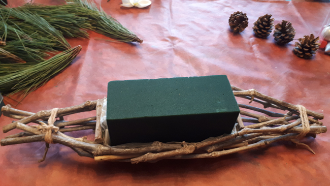 Bootvorm van takken of langwerpig bakje met natte oasis, krammen