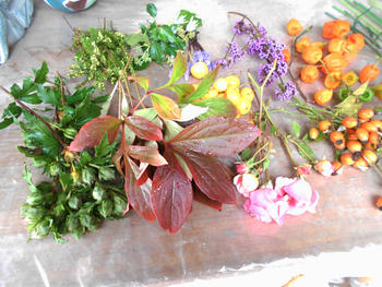 Witte bloemen van de Chinese bieslook, oranje rozenbottels, paarse balletjes van de Callicarpa, oranje bellen van de lampionplant, groene zaaddozen van de hibiscus, gekleurde bladeren van de pioenroos, roosjes, paarse pluimpjes van Liriope muscari, witte winterheide, malus (sierappeltjes), judaspenning takjes en blaadjes