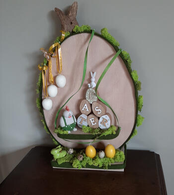 Op het plankje de houten eieren met tekst plaatsen, samen met het groene paaskuikentje.