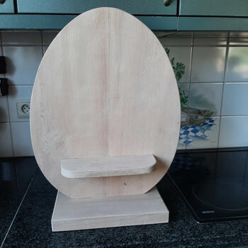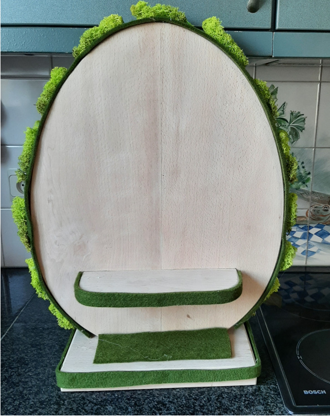 Rond het groot houten ei een strook vilt kleven die iets breder is dan het ei. Smalle stroken vilt rond de bodem en het opzetplankje kleven.