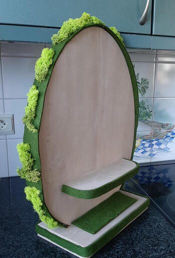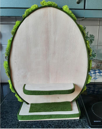 Op de strook vilt, rond het ei, toefjes mos kleven. Het konijnenkopje aan de achterzijde vastkleven met plakband.