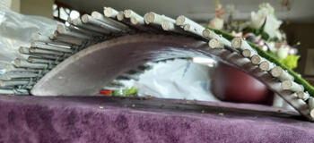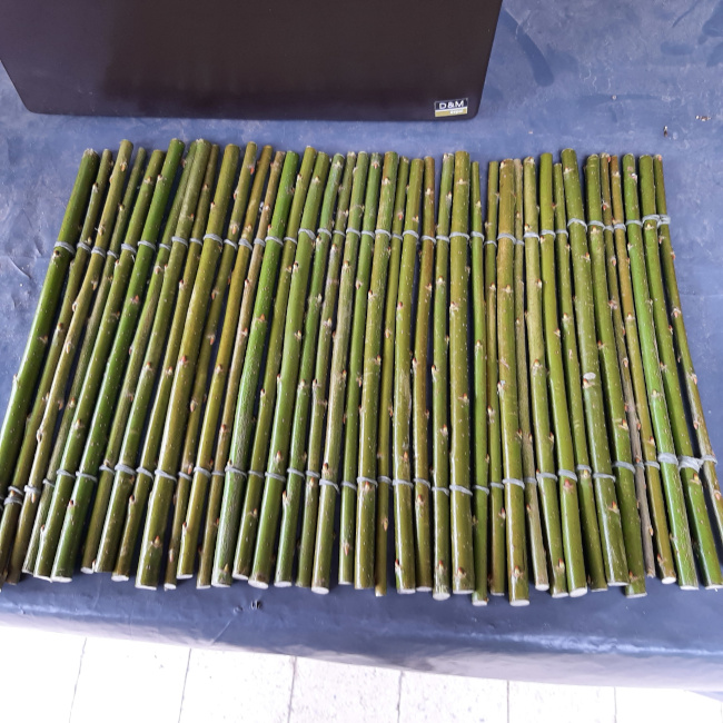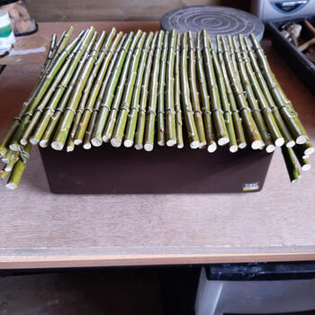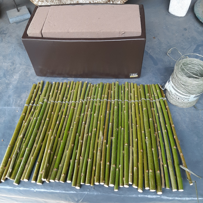 De bladeren van de takken verwijderen en de stokjes allemaal op dezelfde lengte snijden, daarna laten drogen. De stokjes met bindwire, op twee plaatsen, in de lengte vastbinden. Bespuiten met witte verf en laten drogen.