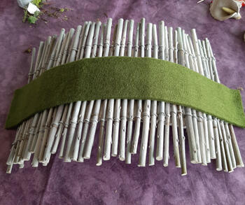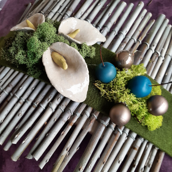 Een strook vilt van 40/15 cm in de lengte in het midden over de stokjes leggen, hier en daar vastkleven. In het midden vanboven mos in verschillende kleur kleven en de drie aronskelken daarop vastkleven.