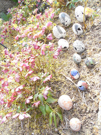 Onregelmatige eieren van witte klei met openingen, rakugebakken met witte glazuur..