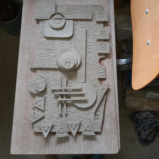 De basisplaten uitrollen, met reliëf bewerken, laten drogen en biscuitbakken.