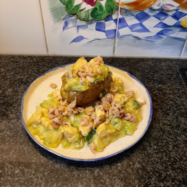Neem de aardappelen uit de oven, snij een dekseltje eruit en verwijder. Schep met een lepel een deel kruim uit de aardappelen, Plet het met een vork en voeg toe aan de saus.