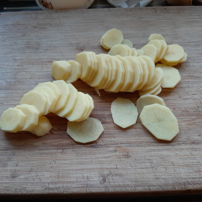 De aardappelen schillen en in plakjes van 1 cm. snijden. |