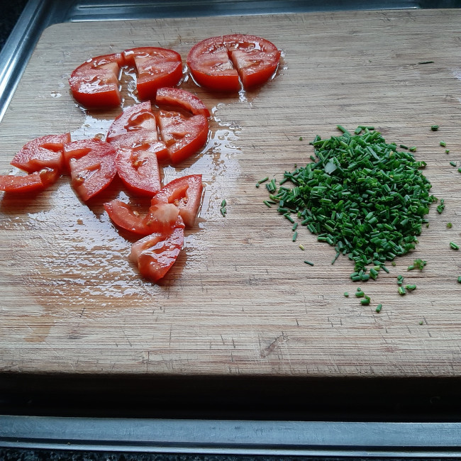 1 tomaat of 10 kerstomaatjes, 2 el fijngesneden bieslook of peterselie, 50 g gemalen kaas