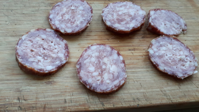 Geut olie, 1 sjalot, 1 teentje look, 100 g chorizo of Italiaanse droge worst, snuif gedroogde oregano, 100 g knolselder, 125 g tomaten passata, ½ groentebouillonblokje, 1 dikke tomaat, 100 g champignons, 1 rode puntpaprika, 75 g rijst, 250 g water, peper, zout