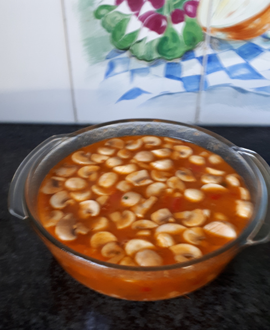 Olie verwarmen, de ui en look daarin fruiten, de oregano, de bleekselder, puntpaprika en champignons toevoegen, bevochtigen met passata. ½ Bouillonblokje, peper en zout toevoegen, de rijst en het water toevoegen.