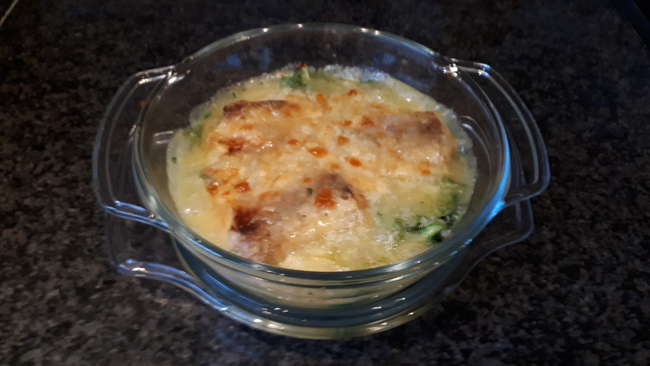 Giet de saus over de vis en de groenten, de vis mag zwemmen in de saus en bestrooi met een weinig geraspte kaas.