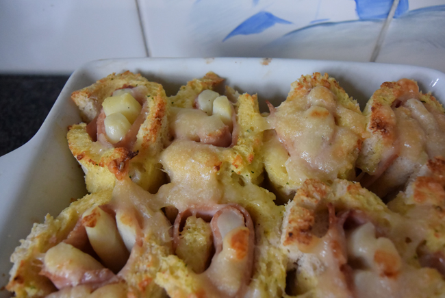Ovenschotel met gevulde broodrolletjes van asperges en ham