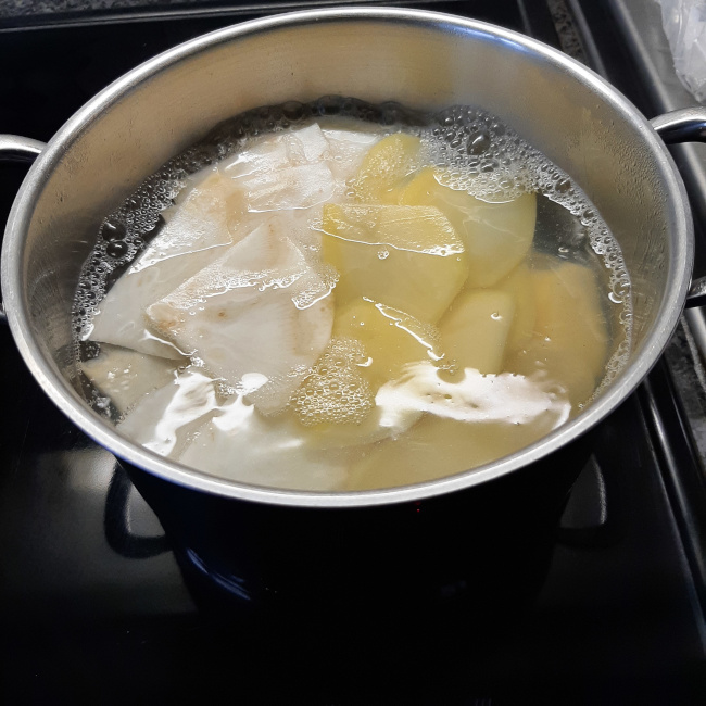Water aan de kook brengen met een snuif zout om de knolselder en de aardappelschijfjes te koken.