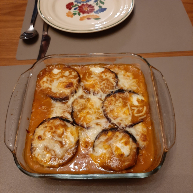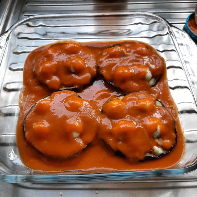 Een laagje tomatensaus over de bodem van een ovenschotel verdelen, aubergineschijven naast elkaar leggen en de helft van de mozzarella erover verdelen. Een laag tomatensaus erover gieten en herhalen met aubergineschijven en mozzarella en eindigen met tomatensaus.