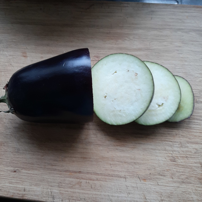 De aubergine in plakken van 1 cm snijden, bestrooien met zout om het vocht eruit te trekken.