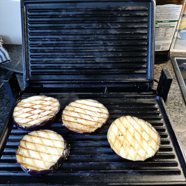 De aubergineschijven met keukenrol afwrijven, met olie inwrijven en in een grillpan of in de oven bakken.