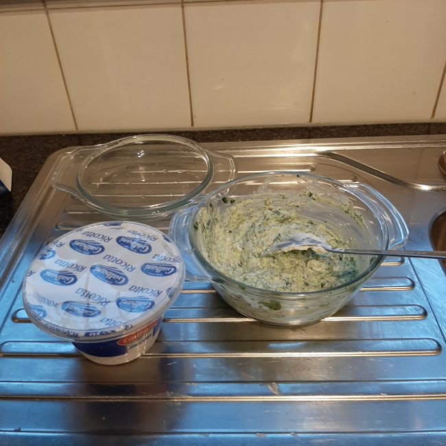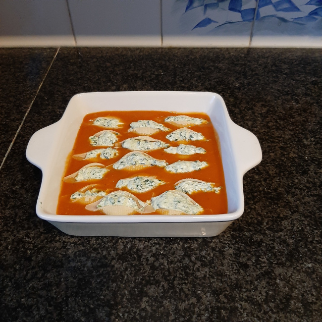 Het water van de ontdooide spinazie afgieten en de ricotta mengen met de spinazie; op smaak brengen met peper en zout en in de spuitzak doen. Vanonder een stukje van de spuitzak afsnijden voor een spuitopening en de vulling in de schelpen spuiten. Leg ze naast elkaar in de tomatensaus.