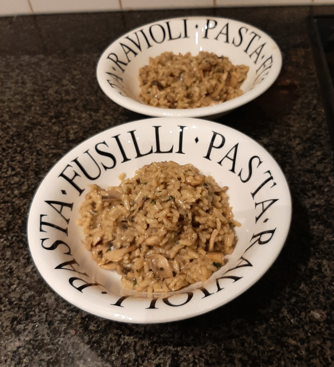 De risotto afwerken met de gebakken champignons, de kaas, een klont boter en op smaak brengen indien nodig met peper en zout.