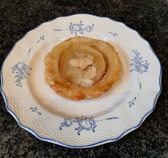 4 plakjes bladerdeeg van 12 à 14 cm, 1 appel, 4 tl honing, 1 el amandelschijfjes, 2 el licht bruine suiker