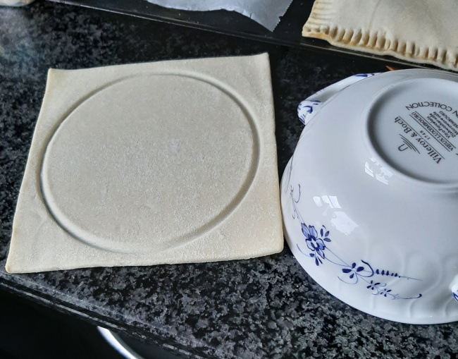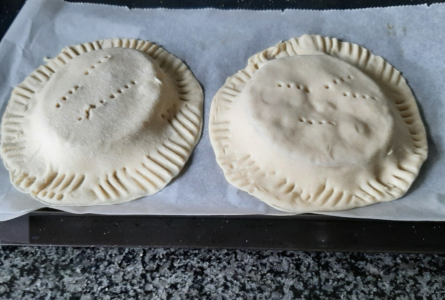 Het bladerdeeg even laten ontdooien. Doormiddel van een grote uitsteek vorm of een bordje of soepkop, een zo groot mogelijke ronde vorm uitsteken of uitsnijden met een mes. Leg ze op een bakplaat die bekleed is met bakpapier.
