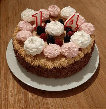 Samenstelling: De koek horizontaal halveren en een dikke laag boterroom tussen de twee lagen smeren. De koek terug samenstellen en de buitenkant besmeren met een dunne laag boterroom zodat de chocoladekorrels blijven kleven. De buitenkant voorzien met hagelslag en de bovenkant versieren met boterroom. De meringuekoekjes net voor het opdienen erop leggen, omdat ze anders lichtjes smelten.