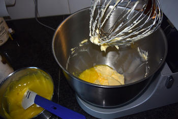 De eierdooiers één voor één toevoegen en goed mixen. De mixer uitschakelen.