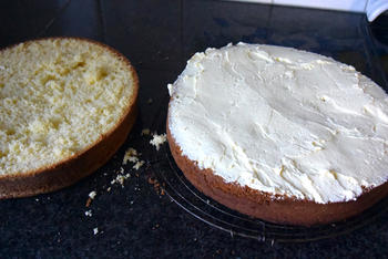 De koek horizontaal halveren en een dikke laag boterroom tussen de twee lagen smeren. De koek terug samenstellen en de buitenkant besmeren met een dunne laag boterroom zodat de suikerpasta blijft kleven. De taart met suikerpasta bekleden. Versieringen kan je met een weinig water vastkleven op de suikerpasta.
