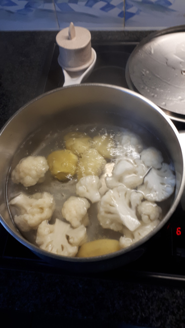 De aardappelen schillen en opzetten in heet water met zout. laat 8 minuten koken en voeg dan de bloemkool toe
