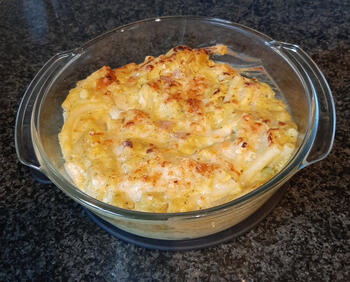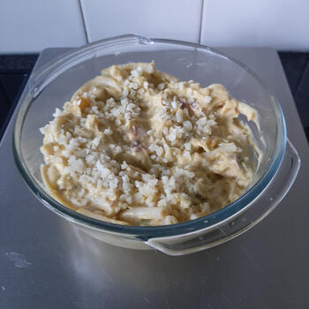 Breng het geheel op smaak met peper en zout en doe in een beboterde ovenschaal en bestrooi de overige kaas en laat 25 minuten gratineren in de oven.
