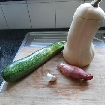 Ondertussen de courgette en pompoen schillen, de pitten verwijderen en het vruchtvlees in blokjes snijden. De sjalot en look fijnsnijden.