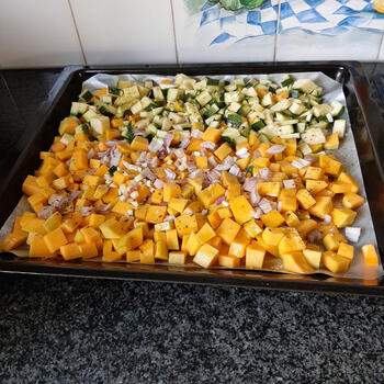 Geut olie, 1 sjalot, 2 teentjes look, 400 g courgetteblokjes, 900 g pompoenblokjes, chili flakes of peper, zout, kurkuma, paprikapoeder