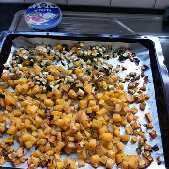 De ricotta mengen met 2 pollepels kookvocht van de macaroni en 2/3 van de geraspte kaas. Voeg de gare groenten en de macaroni toe en eventueel blokjes ham. Meng goed en voeg indien nodig nog wat kookvocht toe, de saus mag goed vochtig zijn omdat een deel vocht nog in de macaroni dringt.