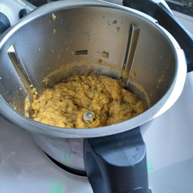 Geut olie, 1 sjalot, 2 teentjes look, 400 g courgetteblokjes, 900 g pompoenblokjes, chili flakes of peper, zout, kurkuma, paprikapoeder