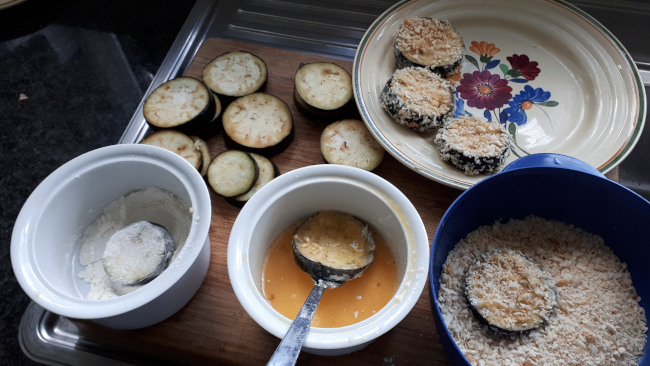 Neem drie kommetjes: een met bloem, een met losgeklopt ei, een met panko of paneermeel. Paneer alle aubergineschijven door ze door bloem, ei en paneermeel te halen. Verhit een flinke geut olijfolie in een braadpan en bak daarin, deel per deel, de aubergineschijven bruin aan beide zijden. Laat uitdruipen op keukenrol.