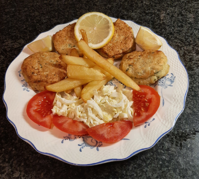 Je kan er frietjes, brood, rijst of pasta bij serveren en een frisse sla. Afwerken met partjes citroen en een dot mayonaise.
