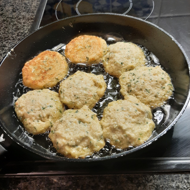 Met natte handen koekjes vormen van het mengsel en in een bodempje olie in een bakpan, op matig vuur de koekjes garen en licht bruin bakken gedurende 6 à 7 minuten aan iedere zijde.