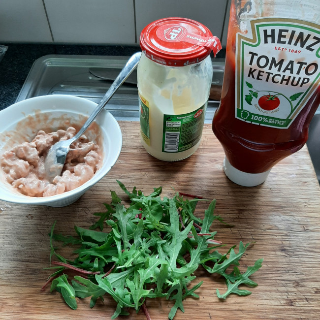 De mayonaise mengen met de tomatenketchup en eventueel whisky, tot een cocktailsaus.